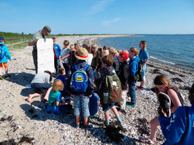 ivrige elever, der blandt andet skulle se den gule engmyre, lave strandkunst, fiske efter krabber og lære om de mange spændende sten, som man kan finde på stranden.