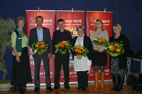Her ses de valgte kandidater flankeret af direktør Lisa Kjær og Gitte H. Sørensen, der er valgt til bankrådet af medarbejderne i Område Rebild.