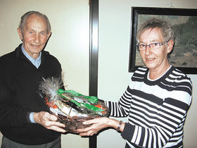 STØVRING: Onsdag den 16. december fyldte Besøgstjenestens ældste besøgsven, Jens Tarp, 93 og i den anledning kiggede besøgsleder Jonna Gribby forbi med en flot kurv med masser af julegodter i.