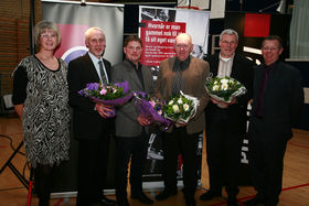 De valgte kandidater fra venstre Karl kr. Andersen, Preben Førby Lassen, Poul Kristian Nielsen flankeret af direktør Lisa Kjær og bankdirektør John Lundsgaard.