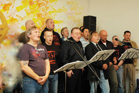 Fangerkoret består af dels nuværende fanger, dels løsladte, som holder fast i kontakten med koret. Og det var ikke pop- eller rockstjerner, som stod her foran os. Det var mennesker som du og jeg. Og det var mennesker, som virkelig havde noget på hjerte! Det ramte helt ind i hjertekulen når de fortalte og hårene rejste sig på armene når de sang. Ikke fordi det var engleblid skønsang. Det var bestemt ikke et drengekor, som mødte os denne lørdag eftermiddag. Men fordi det var et rigtigt mandekor. Stemmer og mennesker med saft og kraft og energi! Dette var ikke et nøje iscenesat show med faste rammer og former. Her var plads til spontan drilleri og svar på tiltale. Og sangerne var ikke topprofessionelle og scenevante. De var usikre på deres pladser og vores forventninger. Men jeg tror, jeg kan tale på alles vegne, de blev i høj grad indfriet. Og mere til!