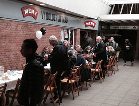Lørdag den 30. maj slog købmand Hans Christensen dørene op til det nye fødevaremarked MENY med masser af gode åbningstilbud og rundstykker og kaffe til alle de morgenfriske kunder i arkaden.