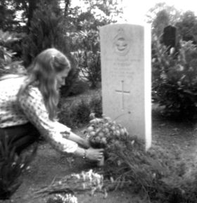 Ann Jordan lægger blomster på sin fars grav i 1981, hvor hun første gang var i Danmark for at se stedet hvor hendes far blev dræbt og se hans grav.
